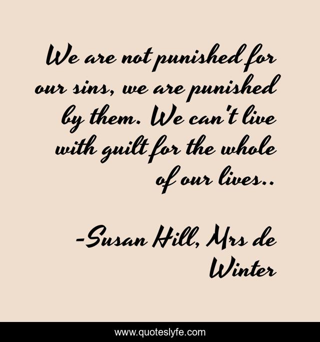 This page presents the quote "We are not punished for our sins, we are punished by them. We can't live with guilt for the whole of our lives..". Author of this quote is Susan Hill, Mrs de Winter. This quote is about guilt, sins,.
