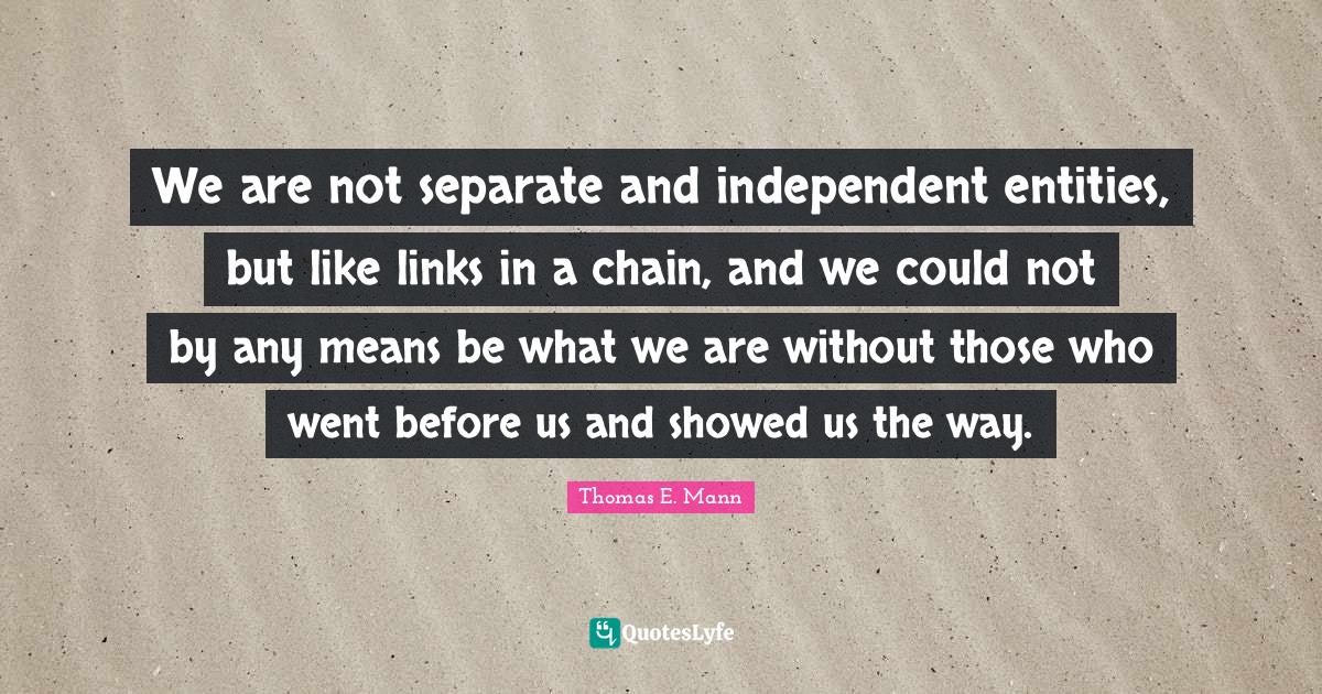 This page presents the quote "We are not separate and independent entities, but like links in a chain, and we could not by any means be what we are without those who went before us and showed us the way.". Author of this quote is Thomas E. Mann. This quote is about love, way, independent, links, friendship, mean,.