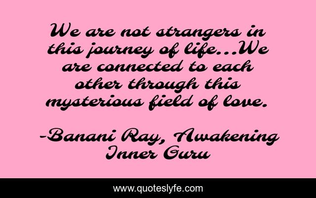 This page presents the quote "We are not strangers in this journey of life…We are connected to each other through this mysterious field of love.". Author of this quote is Banani Ray, Awakening Inner Guru. This quote is about life-and-living, love, life-lessons, affection, inspiration,.