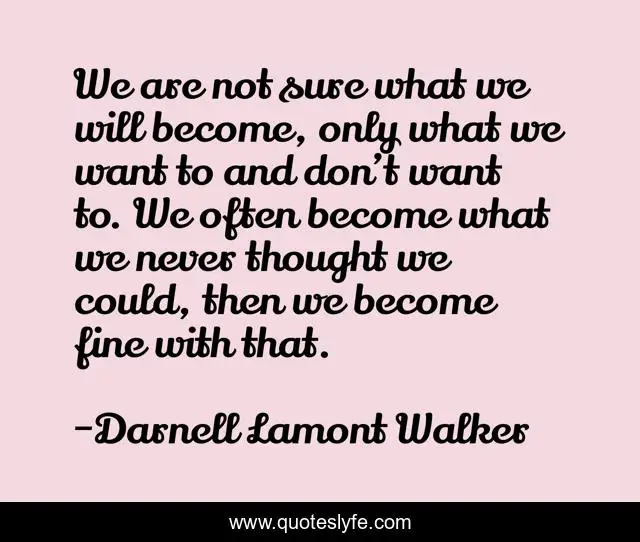This page presents the quote "We are not sure what we will become, only what we want to and don’t want to. We often become what we never thought we could, then we become fine with that.". Author of this quote is Darnell Lamont Walker. This quote is about children, growing-up, adults,.
