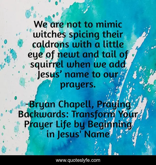 This page presents the quote "We are not to mimic witches spicing their caldrons with a little eye of newt and tail of squirrel when we add Jesus’ name to our prayers.". Author of this quote is Bryan Chapell, Praying Backwards: Transform Your Prayer Life by Beginning in Jesus' Name. .