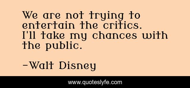 This page presents the quote "We are not trying to entertain the critics. I'll take my chances with the public.". Author of this quote is Walt Disney. This quote is about critics, chances, trying,.