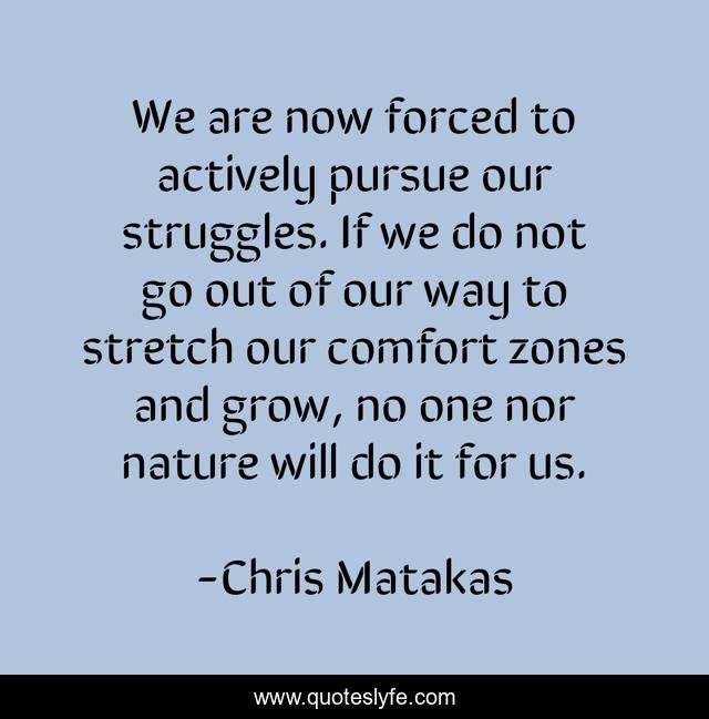 This page presents the quote "We are now forced to actively pursue our struggles. If we do not go out of our way to stretch our comfort zones and grow, no one nor nature will do it for us.". Author of this quote is Chris Matakas. This quote is about progress, growth, society,.