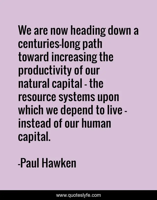 This page presents the quote "We are now heading down a centuries-long path toward increasing the productivity of our natural capital - the resource systems upon which we depend to live - instead of our human capital.". Author of this quote is Paul Hawken. This quote is about path, live, productivity,.