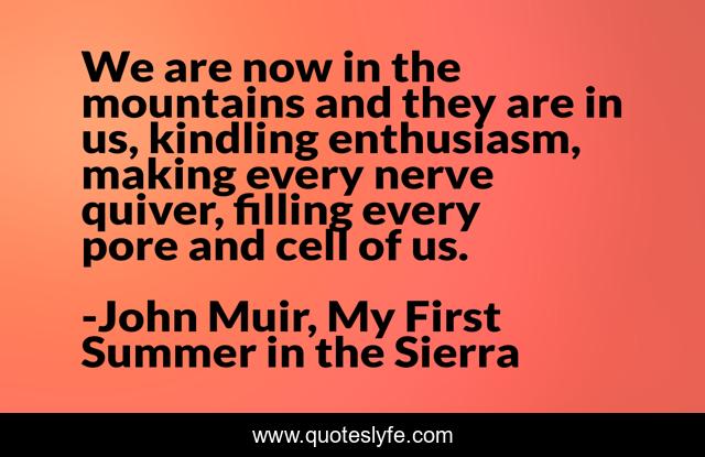 This page presents the quote "We are now in the mountains and they are in us, kindling enthusiasm, making every nerve quiver, filling every pore and cell of us.". Author of this quote is John Muir, My First Summer in the Sierra. This quote is about living, mountains, nature,.