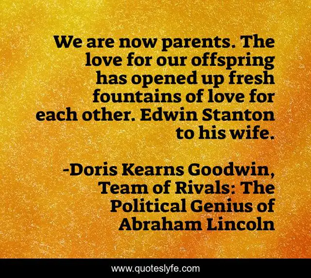 This page presents the quote "We are now parents. The love for our offspring has opened up fresh fountains of love for each other. Edwin Stanton to his wife.". Author of this quote is Doris Kearns Goodwin, Team of Rivals: The Political Genius of Abraham Lincoln. This quote is about parenthood, marriage,.