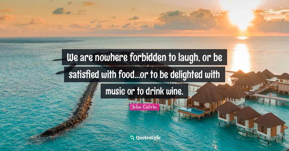 This page presents the quote "We are nowhere forbidden to laugh, or be satisfied with food...or to be delighted with music or to drink wine.". Author of this quote is John Calvin. This quote is about laughing, forbidden, food, satisfied, wine, music, delighted, drink,.