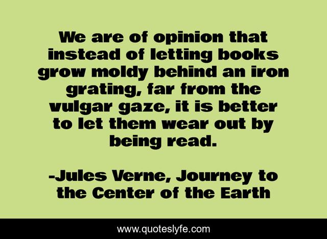 This page presents the quote "We are of opinion that instead of letting books grow moldy behind an iron grating, far from the vulgar gaze, it is better to let them wear out by being read.". Author of this quote is Jules Verne, Journey to the Center of the Earth. This quote is about books, reading,.