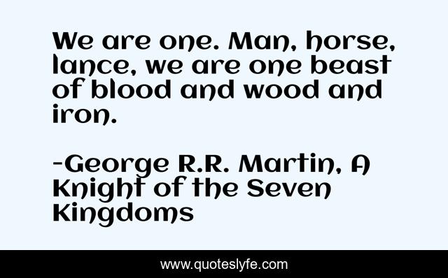 This page presents the quote "We are one. Man, horse, lance, we are one beast of blood and wood and iron.". Author of this quote is George R.R. Martin, A Knight of the Seven Kingdoms. This quote is about lance, horse, word, blood, iron, man,.