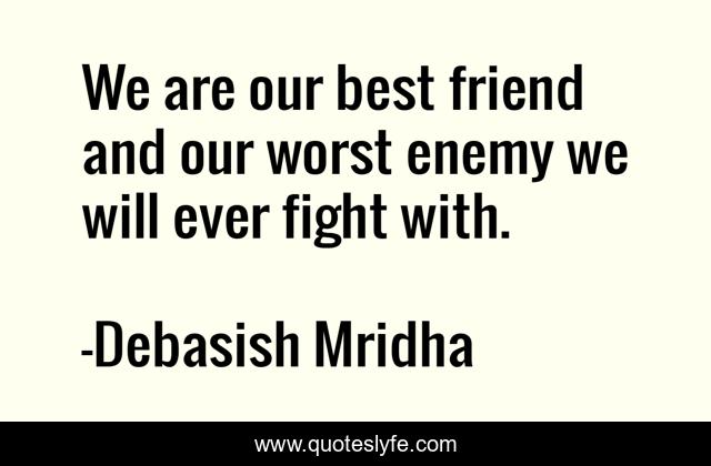 This page presents the quote "We are our best friend and our worst enemy we will ever fight with.". Author of this quote is Debasish Mridha. This quote is about best-friend, enemy, debasish, mridha, philosophy, debasish-mridha, fight, worst-enemy, friend,.