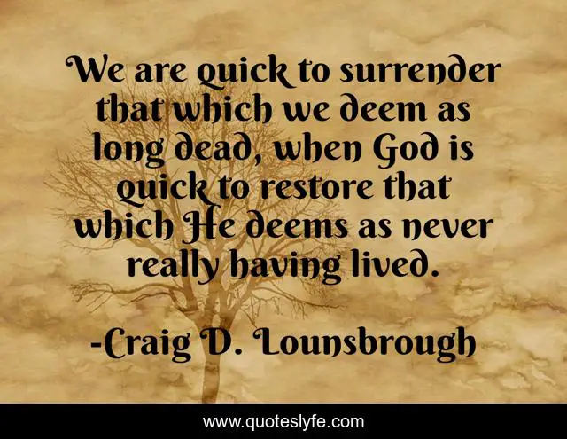 This page presents the quote "We are quick to surrender that which we deem as long dead, when God is quick to restore that which He deems as never really having lived.". Author of this quote is Craig D. Lounsbrough. This quote is about faith, bible, christian, raise, living, god, dead, christianity, resurrect,.
