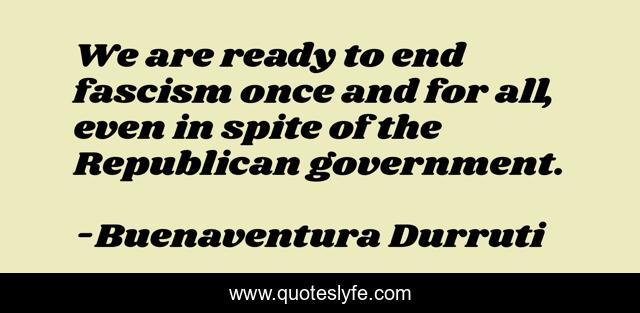 This page presents the quote "We are ready to end fascism once and for all, even in spite of the Republican government.". Author of this quote is Buenaventura Durruti. This quote is about ready, fascism, end,.
