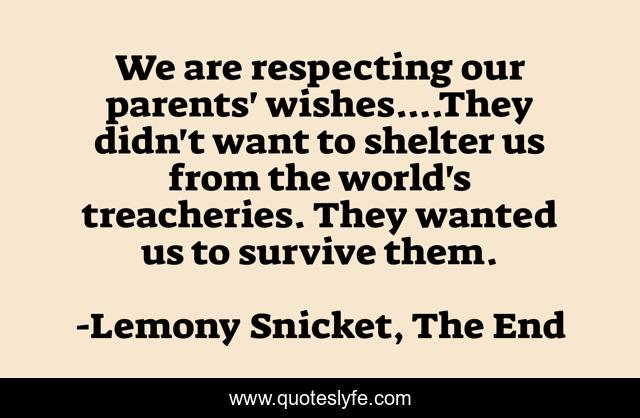 This page presents the quote "We are respecting our parents' wishes....They didn't want to shelter us from the world's treacheries. They wanted us to survive them.". Author of this quote is Lemony Snicket, The End. This quote is about parents-and-responsiblity, parents-and-children, survival, treachery,.