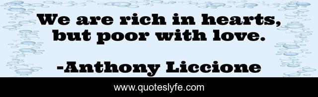 This page presents the quote "We are rich in hearts, but poor with love.". Author of this quote is Anthony Liccione. This quote is about poor, little, love, plenty, lack, unfeeling, heartless, passionless, unloving,.