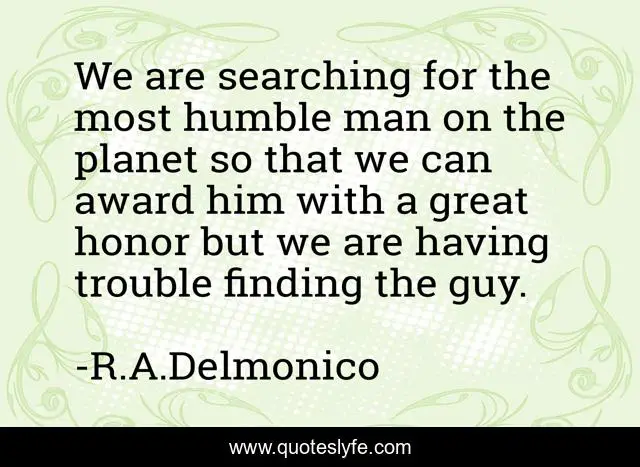 This page presents the quote "We are searching for the most humble man on the planet so that we can award him with a great honor but we are having trouble finding the guy.". Author of this quote is R.A.Delmonico. .