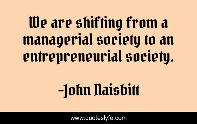 This page presents the quote "We are shifting from a managerial society to an entrepreneurial society.". Author of this quote is John Naisbitt. This quote is about entrepreneurial, shifting,.
