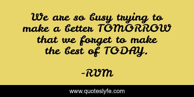 This page presents the quote "We are so busy trying to make a better TOMORROW that we forget to make the best of TODAY.". Author of this quote is RVM. This quote is about motivation, inspiration,.