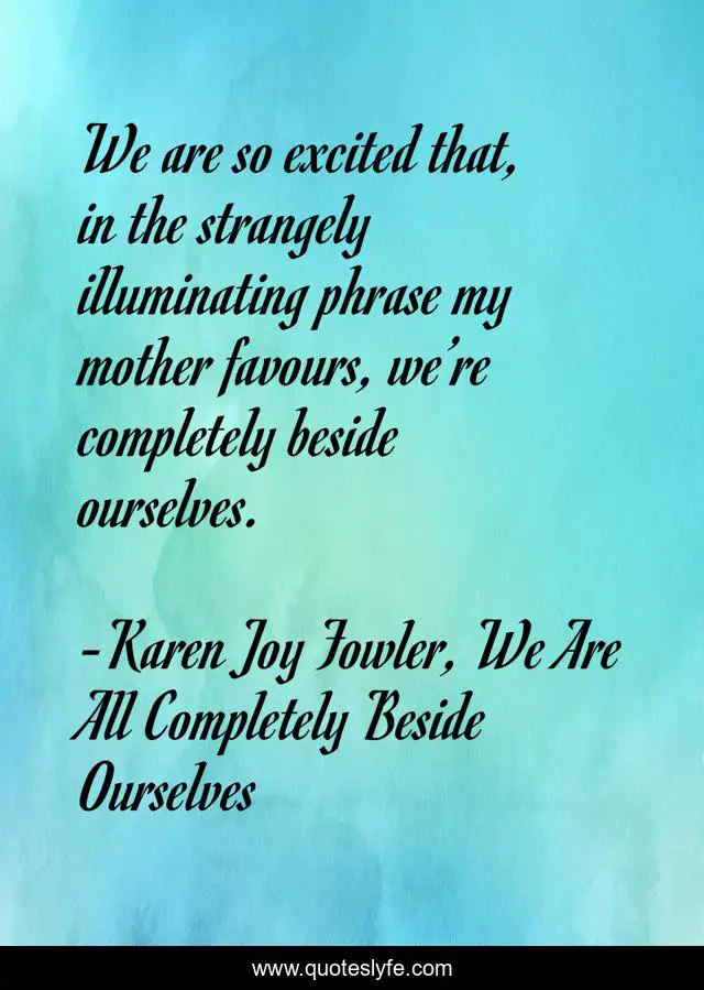 This page presents the quote "We are so excited that, in the strangely illuminating phrase my mother favours, we’re completely beside ourselves.". Author of this quote is Karen Joy Fowler, We Are All Completely Beside Ourselves. This quote is about phrase, completely-beside-ourselves, mother,.