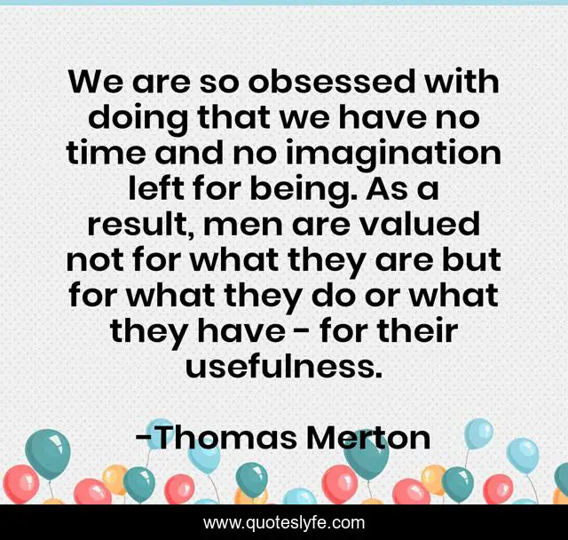 This page presents the quote "We are so obsessed with doing that we have no time and no imagination left for being. As a result, men are valued not for what they are but for what they do or what they have - for their usefulness.". Author of this quote is Thomas Merton. This quote is about imagination, men,.