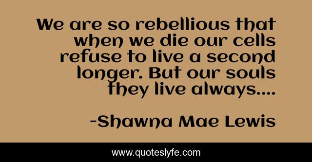 This page presents the quote "We are so rebellious that when we die our cells refuse to live a second longer. But our souls they live always....". Author of this quote is Shawna Mae Lewis. This quote is about rebel, life-and-death, rebellious, rebellion,.