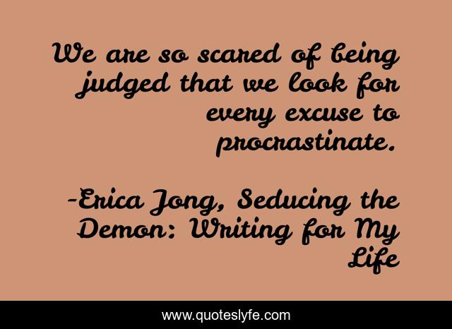 This page presents the quote "We are so scared of being judged that we look for every excuse to procrastinate.". Author of this quote is Erica Jong, Seducing the Demon: Writing for My Life. This quote is about judgement, fear, procrastination,.