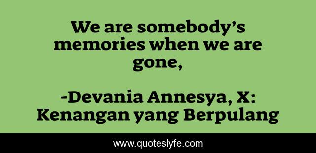 This page presents the quote "We are somebody’s memories when we are gone, ". Author of this quote is Devania Annesya, X: Kenangan yang Berpulang. This quote is about memories, kenangan, somebody, gone,.