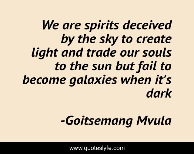 This page presents the quote "We are spirits deceived by the sky to create light and trade our souls to the sun but fail to become galaxies when it's dark". Author of this quote is Goitsemang Mvula. This quote is about galaxies, sky, spirits, light-and-darkness, sun,.