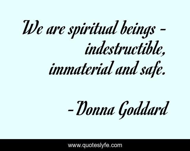 This page presents the quote "We are spiritual beings - indestructible, immaterial and safe.". Author of this quote is Donna Goddard. This quote is about spiritual-growth, self-love, love, spiritual-wisdom, donna-goddard, spiritual, spirituality, self-improvement, self-help,.