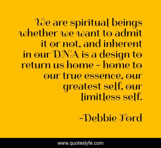 This page presents the quote "We are spiritual beings whether we want to admit it or not, and inherent in our DNA is a design to return us home - home to our true essence, our greatest self, our limitless self.". Author of this quote is Debbie Ford. This quote is about home, spiritual, self,.