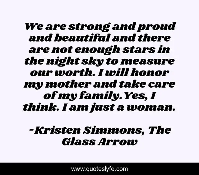 This page presents the quote "We are strong and proud and beautiful and there are not enough stars in the night sky to measure our worth. I will honor my mother and take care of my family.Yes, I think. I am just a woman.". Author of this quote is Kristen Simmons, The Glass Arrow. This quote is about the-glass-arrow, feminist, aya, women,.