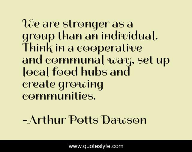 This page presents the quote "We are stronger as a group than an individual. Think in a cooperative and communal way, set up local food hubs and create growing communities.". Author of this quote is Arthur Potts Dawson. This quote is about stronger, group, think,.