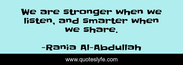 This page presents the quote "We are stronger when we listen, and smarter when we share.". Author of this quote is Rania Al-Abdullah. .