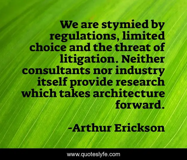 This page presents the quote "We are stymied by regulations, limited choice and the threat of litigation. Neither consultants nor industry itself provide research which takes architecture forward.". Author of this quote is Arthur Erickson. This quote is about forward, choice, research,.