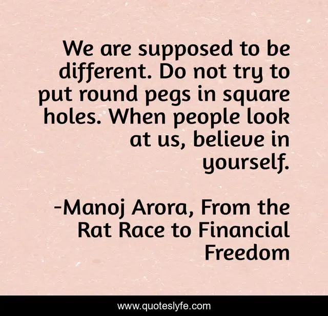 This page presents the quote "We are supposed to be different. Do not try to put round pegs in square holes. When people look at us, believe in yourself.". Author of this quote is Manoj Arora, From the Rat Race to Financial Freedom. This quote is about believe-in-yourself, different, believe, people,.