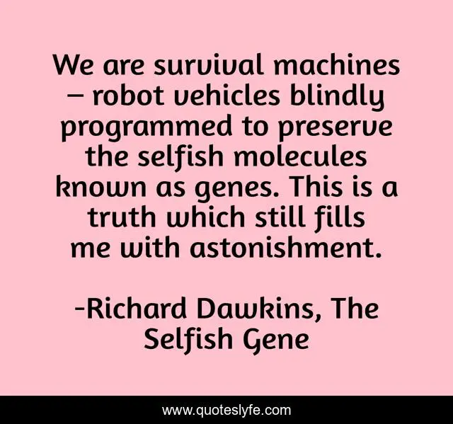 "Richard Dawkins, The Selfish Gene Quotes." Quoteslyfe.com, 2025. Sun. 07 Dec. 2025. <https://www.quoteslyfe.com/quote/We-are-survival-machines-robot-vehicles-blindly-41832>.