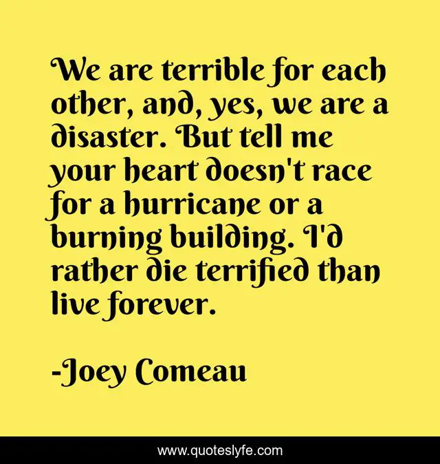 This page presents the quote "We are terrible for each other, and, yes, we are a disaster. But tell me your heart doesn't race for a hurricane or a burning building. I'd rather die terrified than live forever.". Author of this quote is Joey Comeau. This quote is about love, disaster, affection, living-life,.