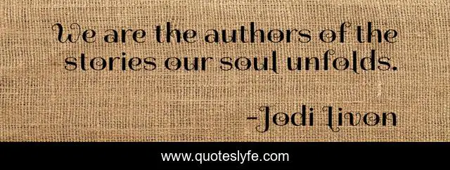 This page presents the quote "We are the authors of the stories our soul unfolds.". Author of this quote is Jodi Livon. This quote is about spiritual, medium, love, the-happy-medium, soul, joyful-living, jodi-livon, spirituality, affirmations,.