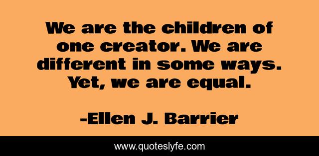 This page presents the quote "We are the children of one creator. We are different in some ways. Yet, we are equal.". Author of this quote is Ellen J. Barrier. This quote is about equal-rights, life, equality, equal, human-rights,.