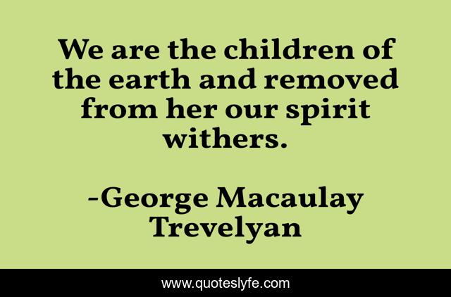 This page presents the quote "We are the children of the earth and removed from her our spirit withers.". Author of this quote is George Macaulay Trevelyan. This quote is about earth, children, spirit,.