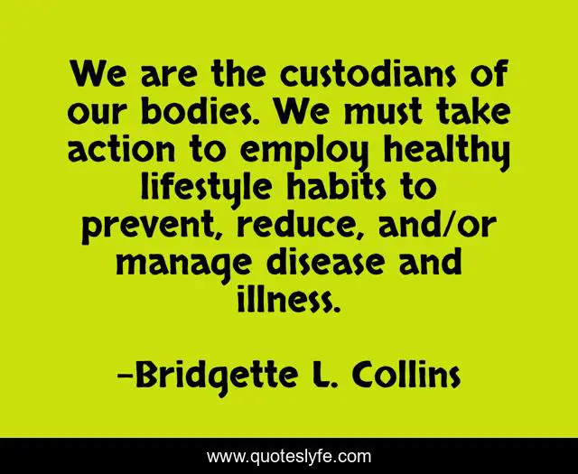 This page presents the quote "We are the custodians of our bodies. We must take action to employ healthy lifestyle habits to prevent, reduce, and/or manage disease and illness.". Author of this quote is Bridgette L. Collins. This quote is about prevention-is-better-than-cure, healthy-living, health, fitness, healthy-habits, healthy-lifestyle,.