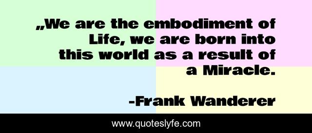 This page presents the quote "„We are the embodiment of Life, we are born into this world as a result of a Miracle.". Author of this quote is Frank Wanderer. This quote is about life, consciousness, miracle,.