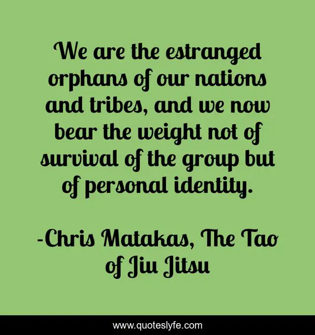 This page presents the quote "We are the estranged orphans of our nations and tribes, and we now bear the weight not of survival of the group but of personal identity.". Author of this quote is Chris Matakas, The Tao of Jiu Jitsu. This quote is about tribe, individuality, identity, nation,.