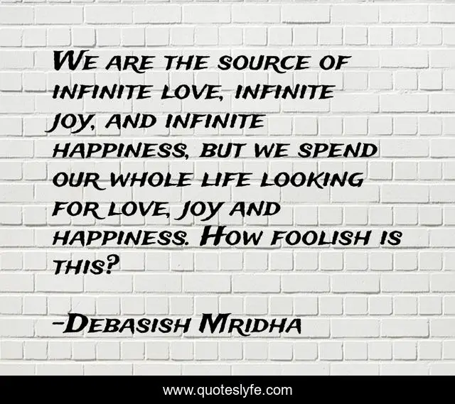 This page presents the quote "We are the source of infinite love, infinite joy, and infinite happiness, but we spend our whole life looking for love, joy and happiness. How foolish is this?". Author of this quote is Debasish Mridha. This quote is about life, love, knowledge, inspirational, intelligence, philosophy, wisdom, source, affection,.