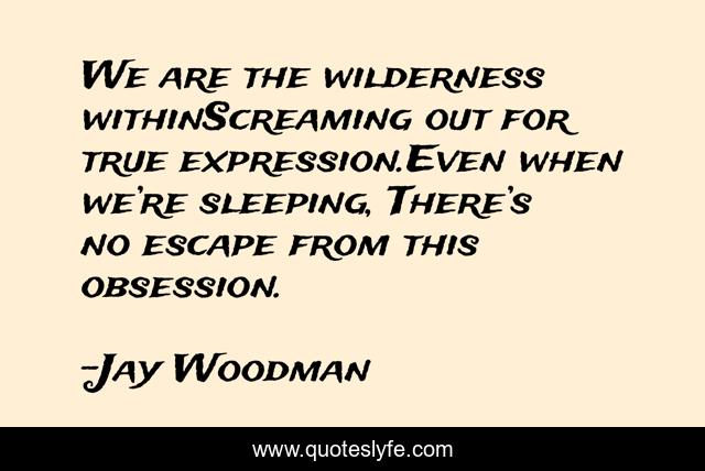 This page presents the quote "We are the wilderness withinScreaming out for true expression.Even when we’re sleeping, There’s no escape from this obsession.". Author of this quote is Jay Woodman. This quote is about expression, within, obsession, wilderness, escape,.