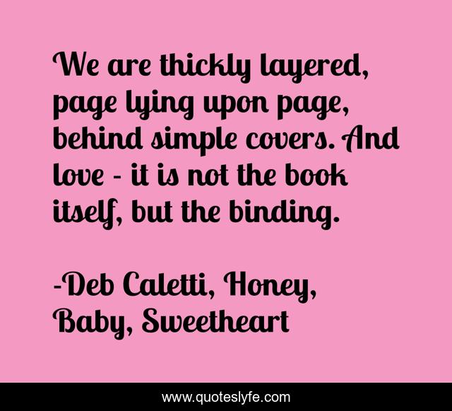 This page presents the quote "We are thickly layered, page lying upon page, behind simple covers. And love - it is not the book itself, but the binding.". Author of this quote is Deb Caletti, Honey, Baby, Sweetheart. This quote is about life, books, love, affection,.
