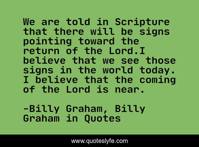 This page presents the quote "We are told in Scripture that there will be signs pointing toward the return of the Lord.I believe that we see those signs in the world today. I believe that the coming of the Lord is near.". Author of this quote is Billy Graham, Billy Graham in Quotes. This quote is about billy-graham, coming-of-the-lord, signs, lord, end-times, scripture,.
