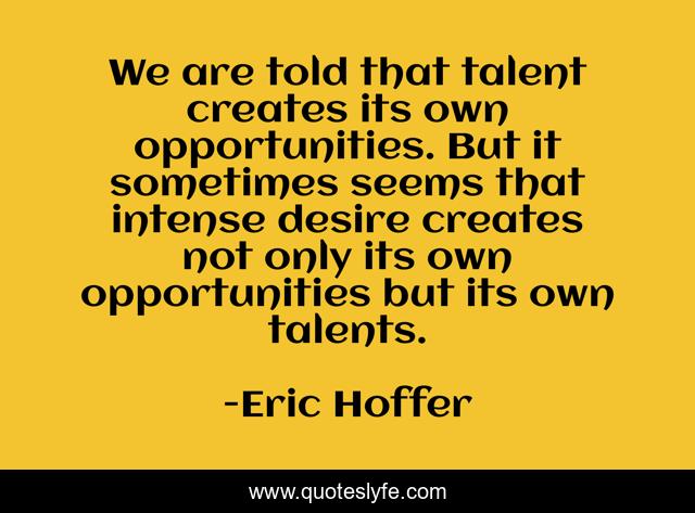 This page presents the quote "We are told that talent creates its own opportunities. But it sometimes seems that intense desire creates not only its own opportunities but its own talents.". Author of this quote is Eric Hoffer. .
