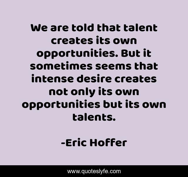 This page presents the quote "We are told that talent creates its own opportunities. But it sometimes seems that intense desire creates not only its own opportunities but its own talents.". Author of this quote is Eric Hoffer. This quote is about talent, inspiration,.