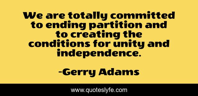 This page presents the quote "We are totally committed to ending partition and to creating the conditions for unity and independence.". Author of this quote is Gerry Adams. This quote is about unity, creating, ending,.
