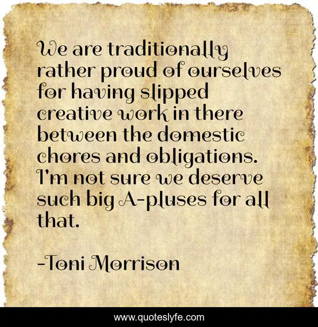 This page presents the quote "We are traditionally rather proud of ourselves for having slipped creative work in there between the domestic chores and obligations. I'm not sure we deserve such big A-pluses for all that.". Author of this quote is Toni Morrison. .